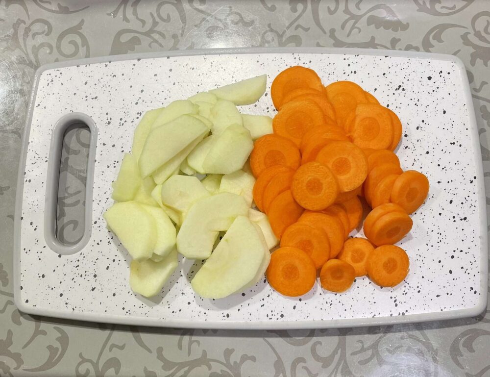 - Яблоко выбираем кислого сорта. Режем плод пополам, удаляем кожуру и сердцевину с косточками. Рубим ломтиками. Морковь чистим, шинкуем кружками.