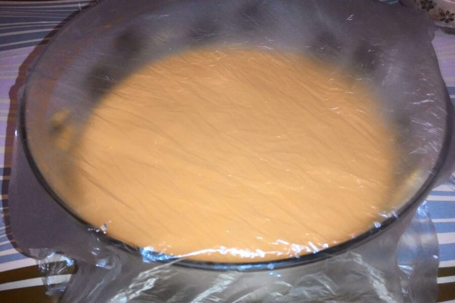- Накрываем емкость полиэтиленовой пленкой. Сверху кладем чистое махровое полотенце. Оставляем тесто на 30 минут, чтобы дрожжи начали «работать».