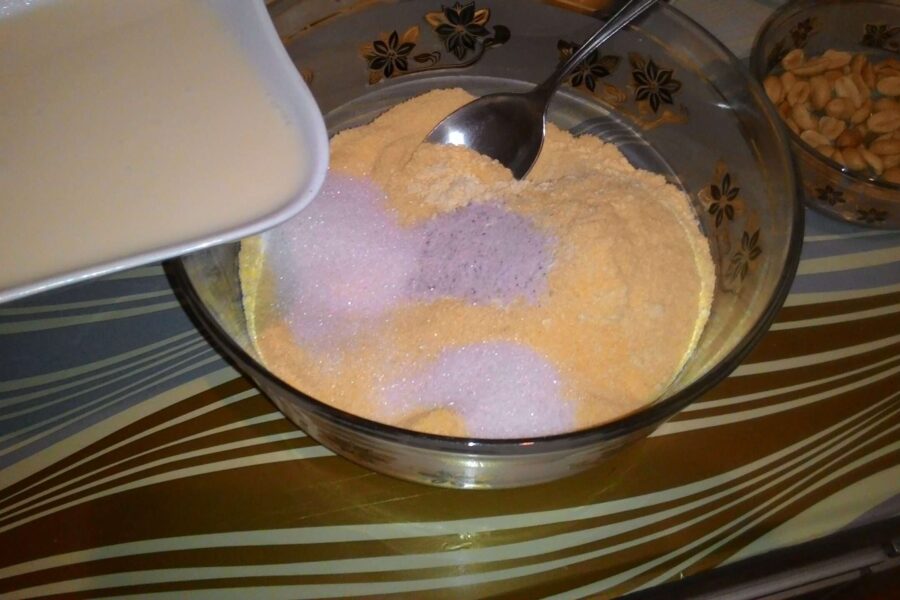 - Пока дрожжи активируются, я беру кофемолку и превращаю кукурузную крупу мелкого помола в муку.