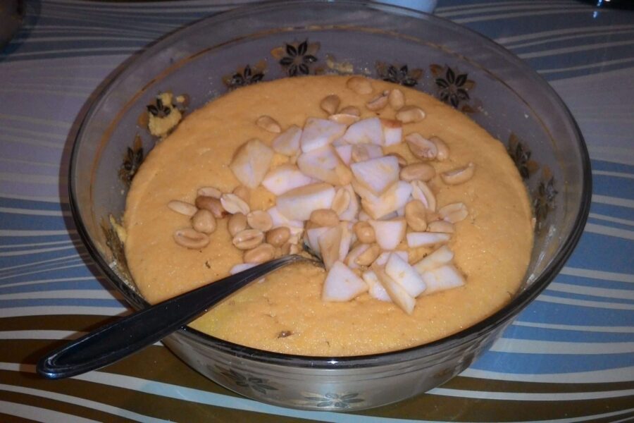- Тесто получилось средней консистенции и поднялось. Осталось добавить орехи и свежие фрукты. Можно класть сухофрукты. Тщательно перемешиваем.