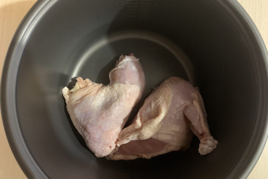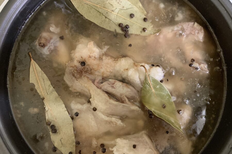 - Теперь приступаем к варке мяса. Я готовила его в мультиварке, но вы сможете это сделать в обычной кастрюле. На дно укладываем курицу, рульку и остатки мяса. Для прозрачности бульона обязательно кладем очищенные луковицы, а для вкуса – чеснок. Заливаем водой до краев, солим и ставим на огонь минимум на 5 часов. За 30 минут до готовности кладем в кастрюлю черный перец горошком и несколько листиков лаврушки.