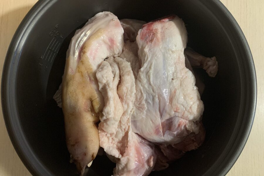 - Чтобы холодец получился не только вкусным, но и прозрачным важно заняться мясом накануне. Оптимально приготовить продукты вечером, а уже с утра заняться непосредственно приготовлением главного блюда. Промытую курятину оставляем в воде, а прежде, чем замочить свиную рульку, не забываем ее поскоблить ножом от остатков щетины и грязи. Благодаря воде из мяса уйдет вся кровь, а холодец получится еще вкуснее. Дайте мясу постоять в воде 7-8 часов.