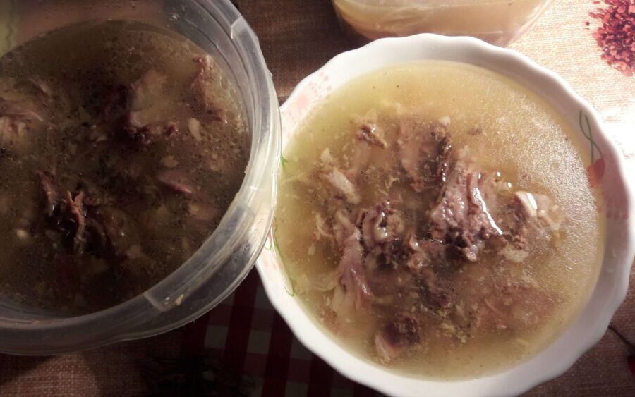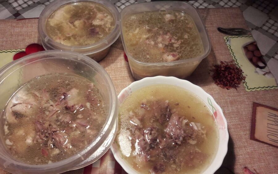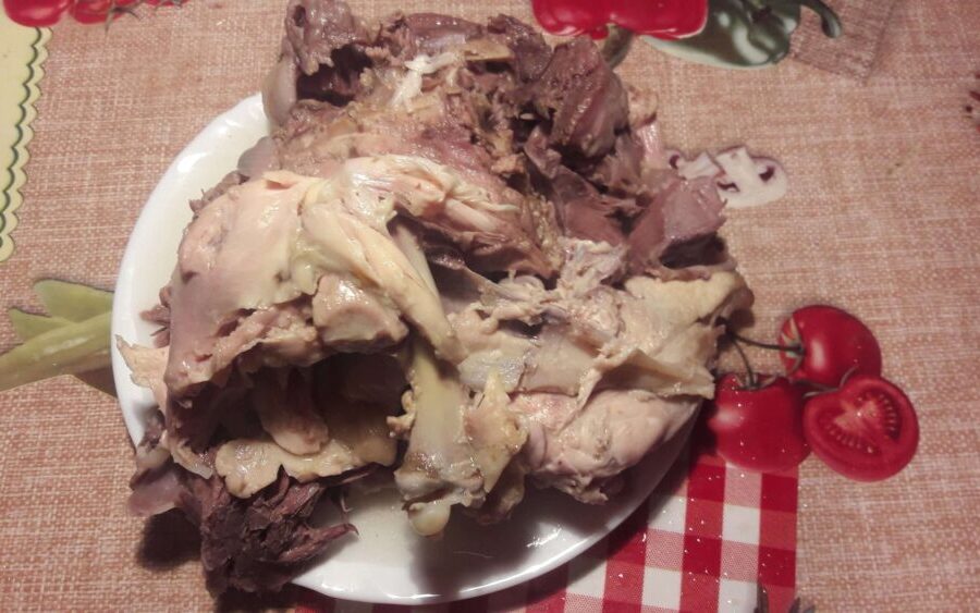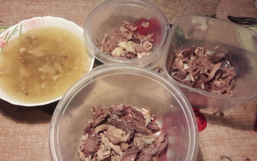 - Отставляем с плиты и ждем неполного остывания бульона. Следующий шаг – это разделка мяса и подготовка посуды, где будет остывать холодец.
