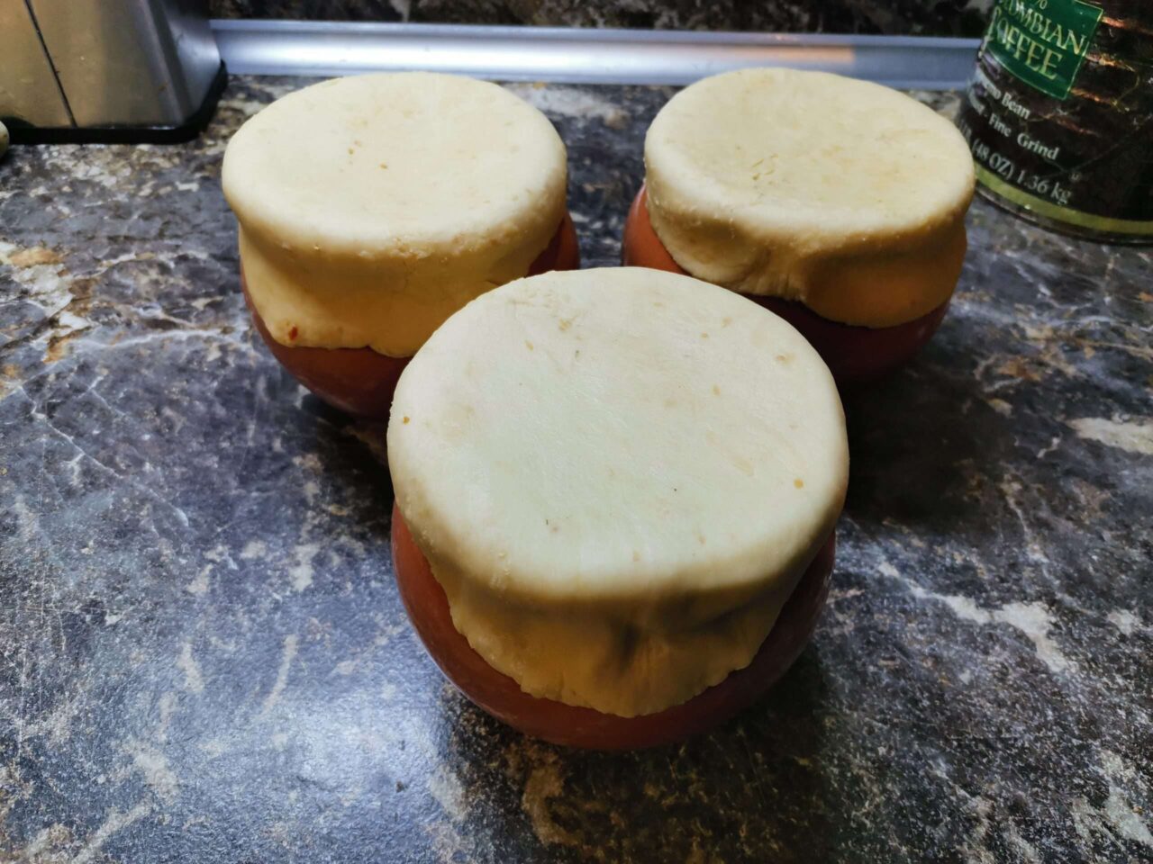 - Иногда вместе глиняных крышек я использую тесто. Делаю его сама или просто покупаю дрожжевое. Раскатываю круги диаметром чуть больше горловины, плотно залепляю.