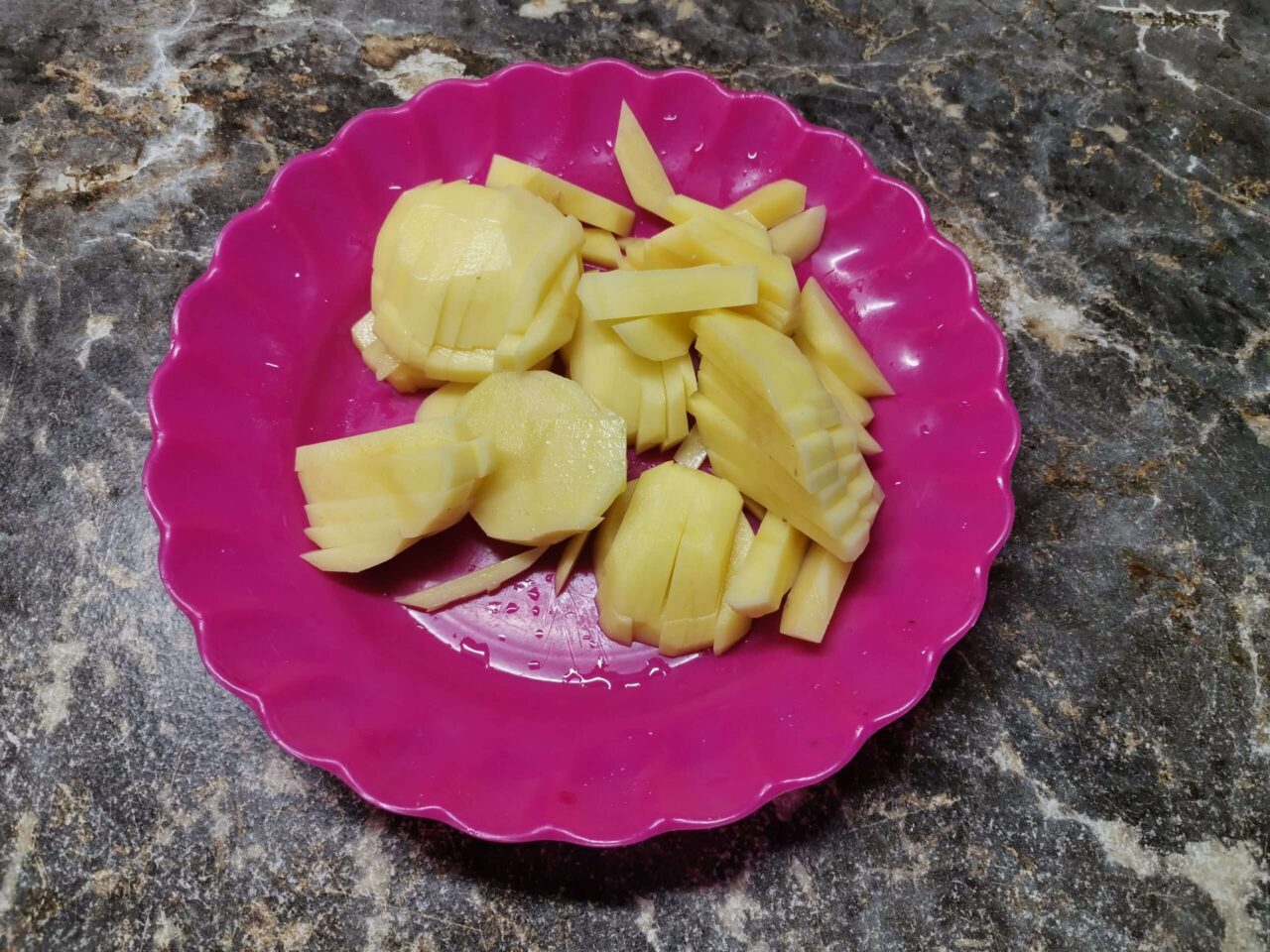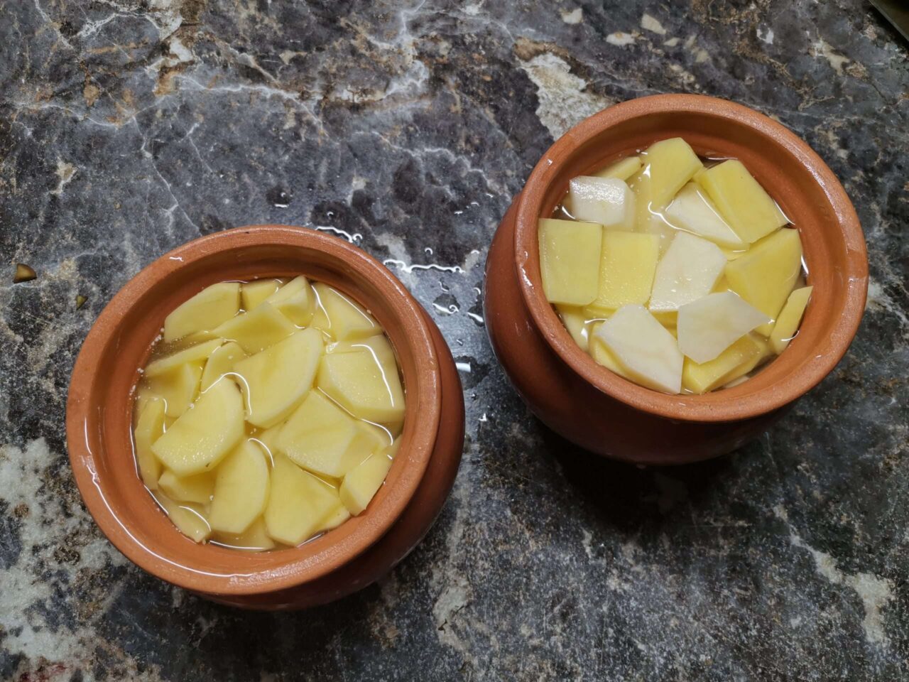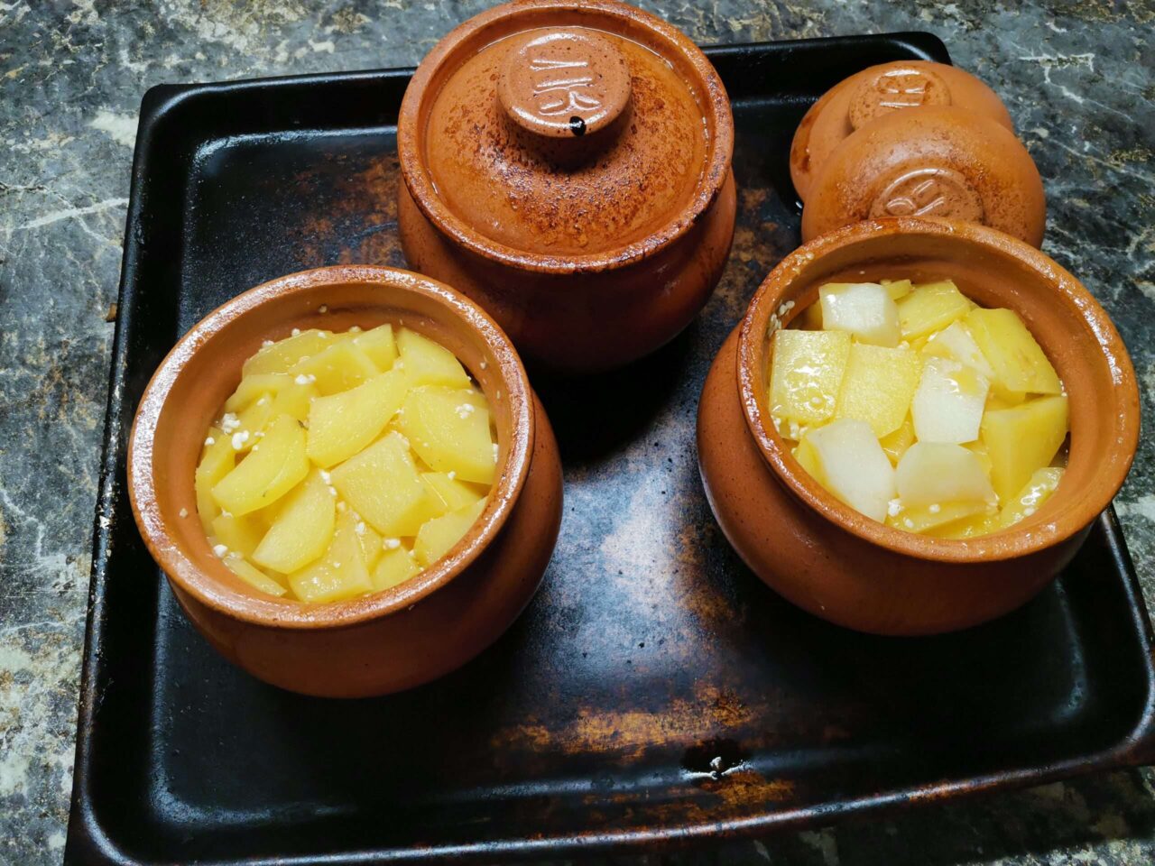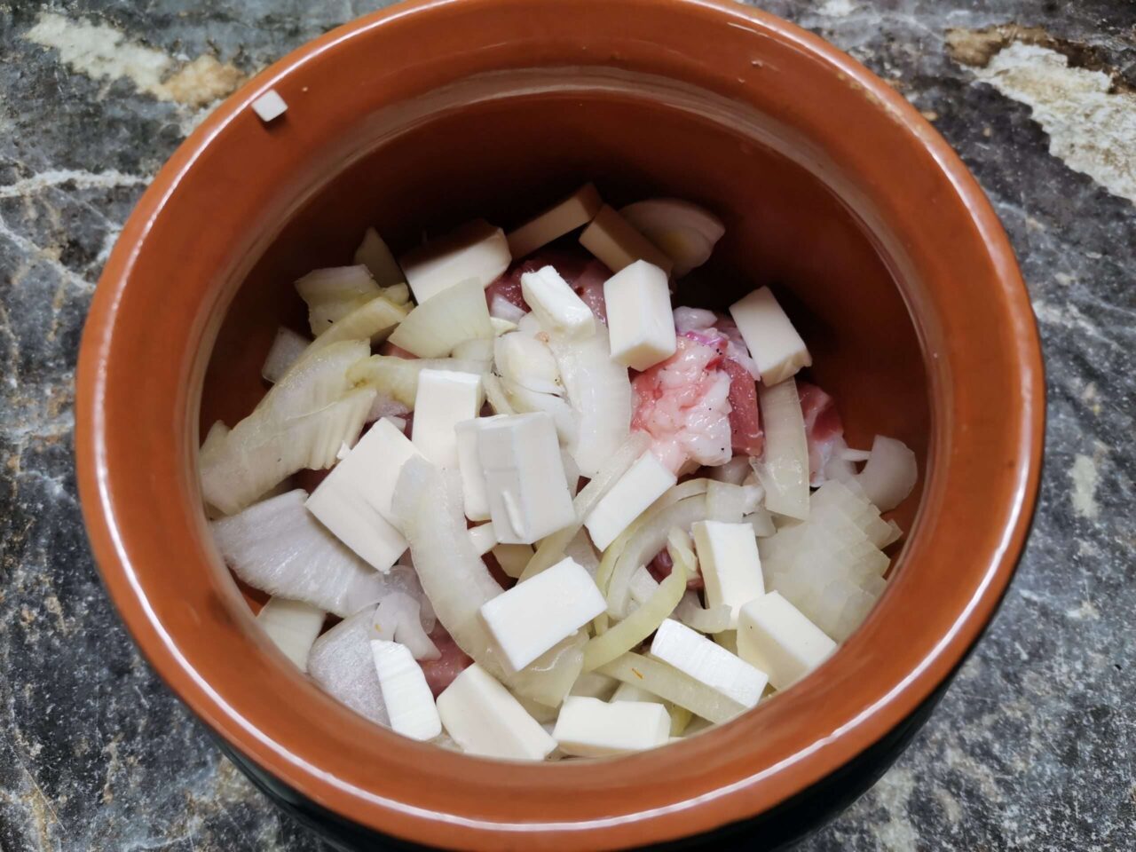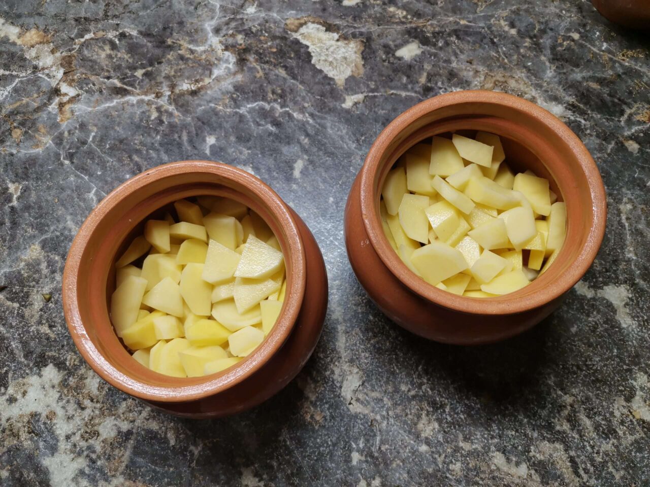 - Сверху картофель, чтобы заполнить горшочек на 2/3.