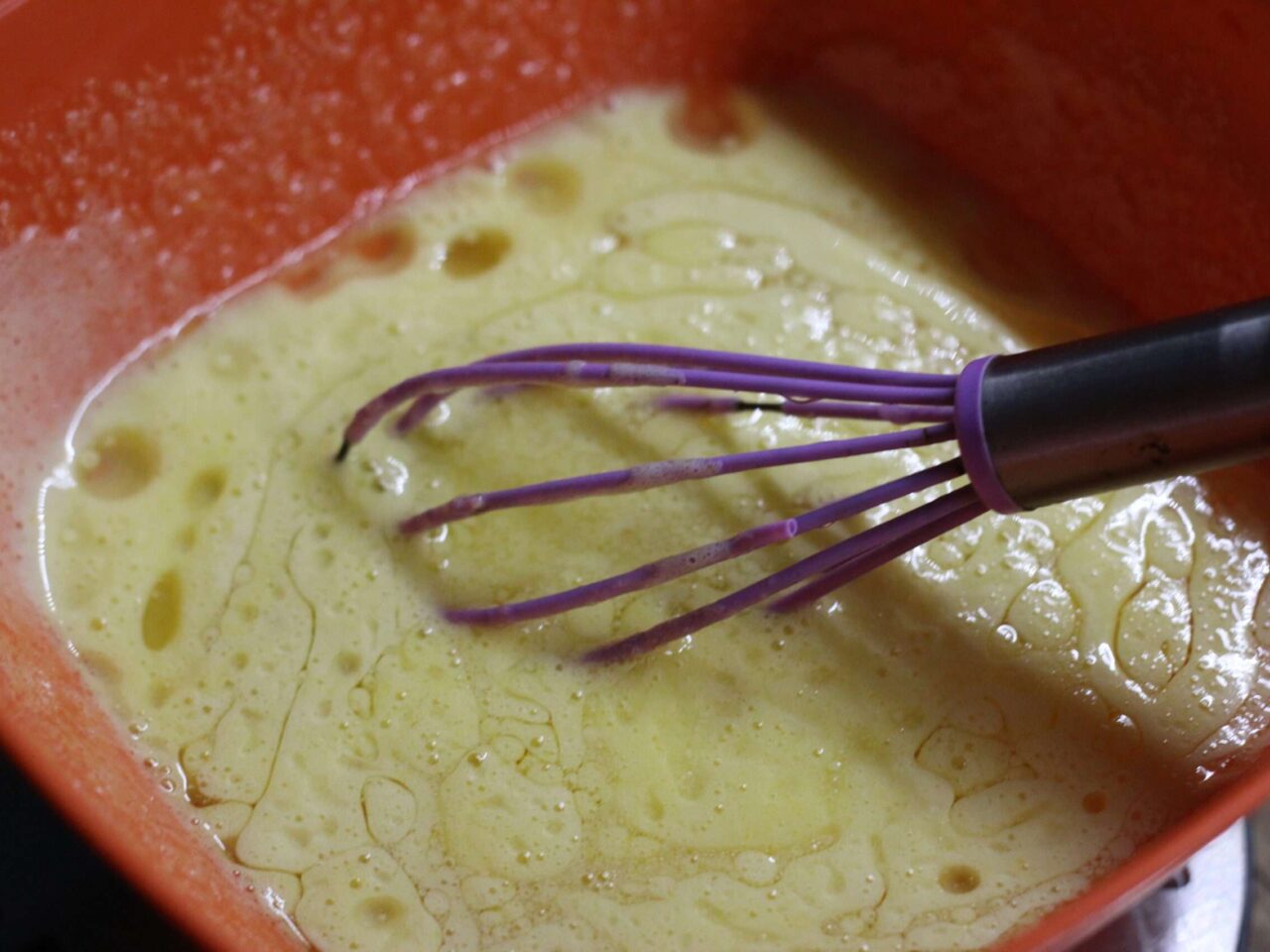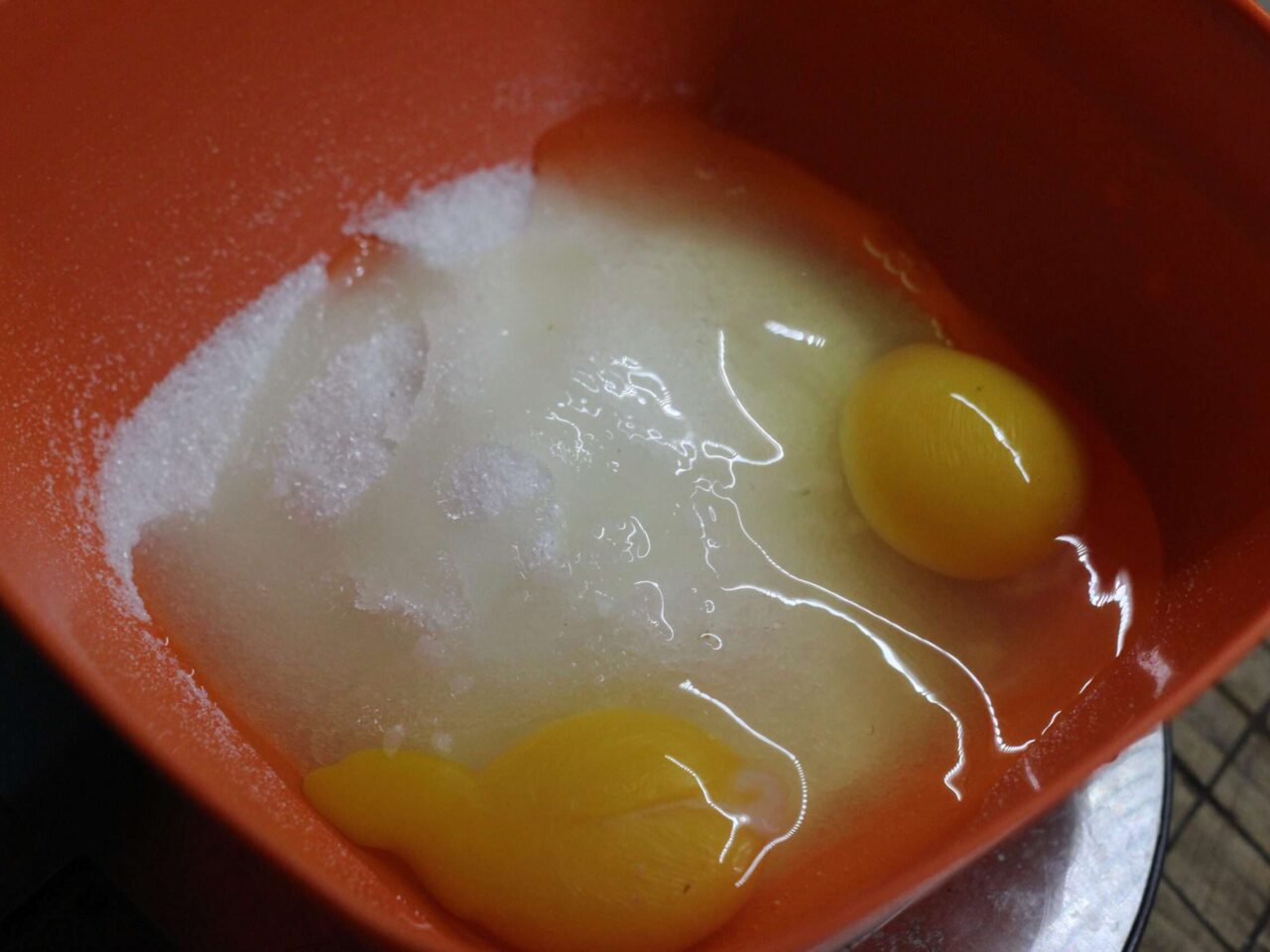 - Прежде всего следует взбить до кремообразной массы сахар с яйцами, ванилью и солью.