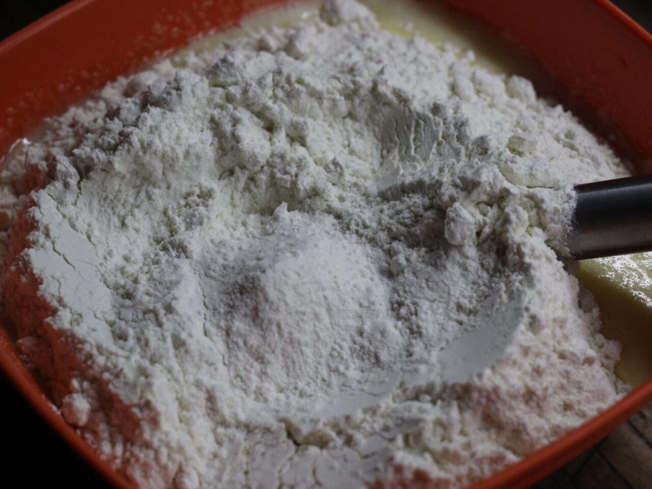 - Всыпать разрыхлитель и муку, аккуратно перемешать тесто.