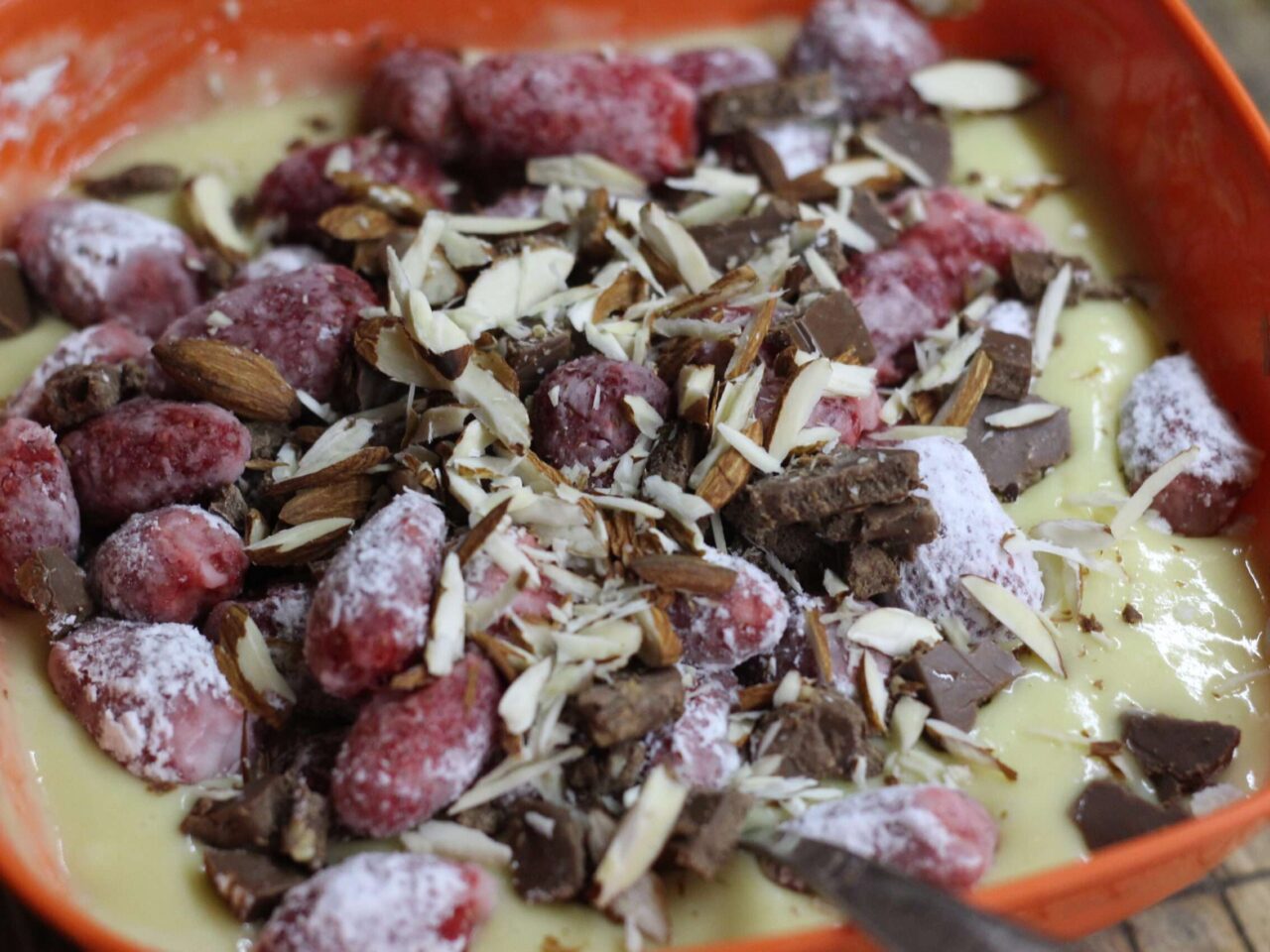 - Обвалять клубнику в крахмале или сахаре, добавить в тесто. Также всыпать рубленый миндаль и шоколад, перемешать смесь.