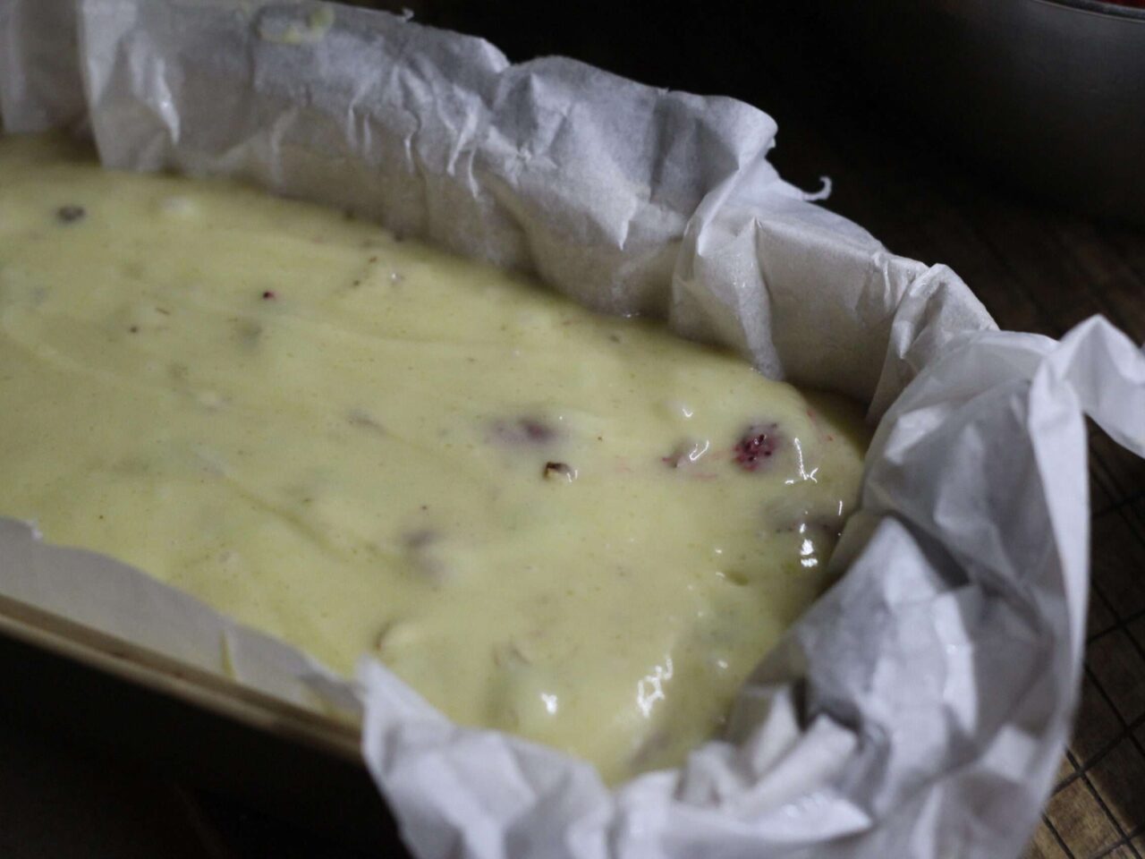 - Выложить тесто в формочку с пергаментом. Выпекать кекс до сухой шпажки при 180 градусах.