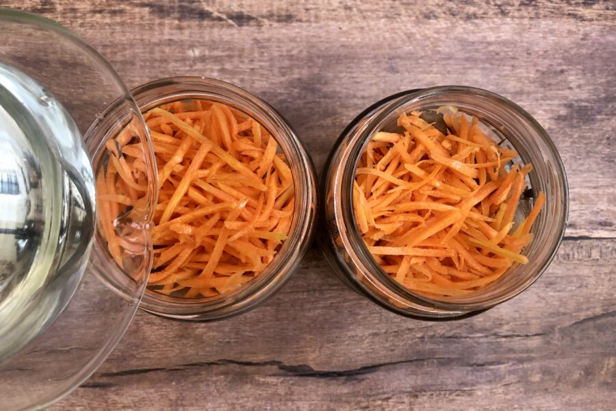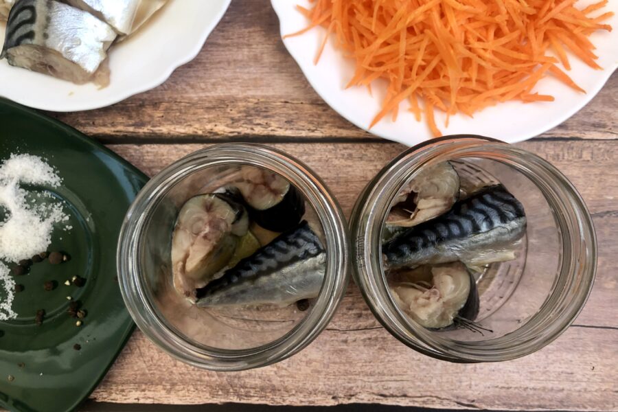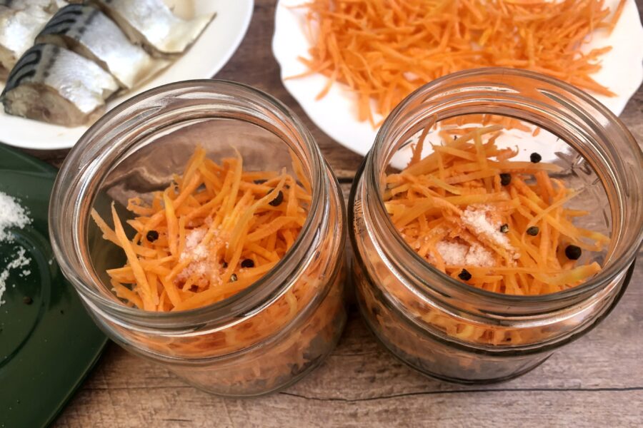 - Накрыть рыбу половиной порции моркови. Посолить оставшейся частью соли, добавить горошины перца. Далее опять слой рыбы и слой моркови, пока банка не окажет заполненной до плечиков.