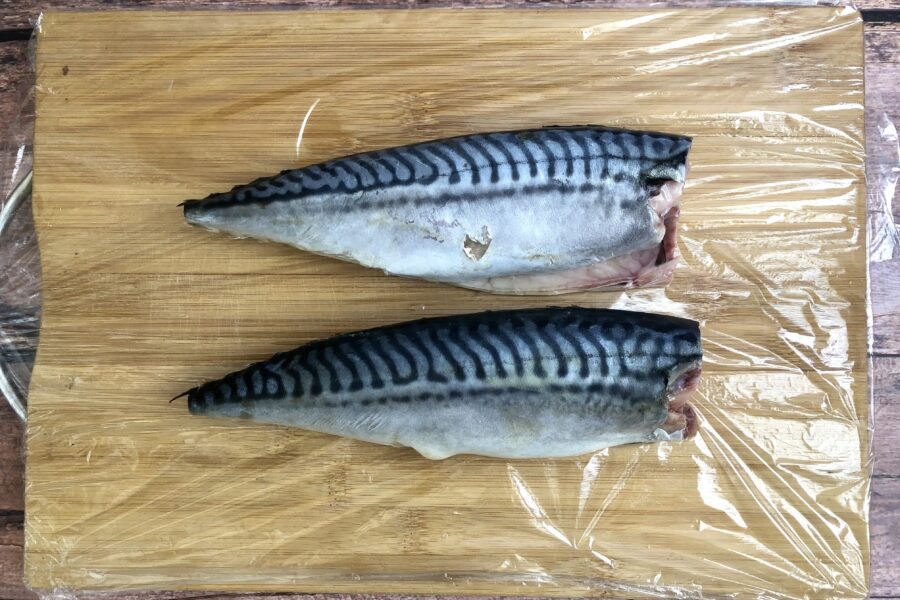 - Скумбрию разморозить при комнатной температуре, не используя для этих целей ускоренных методов разморозки при помощи микроволновки или горячей воды. Тушки выпотрошить, удалить черные пленки и промыть в прохладной воде.
