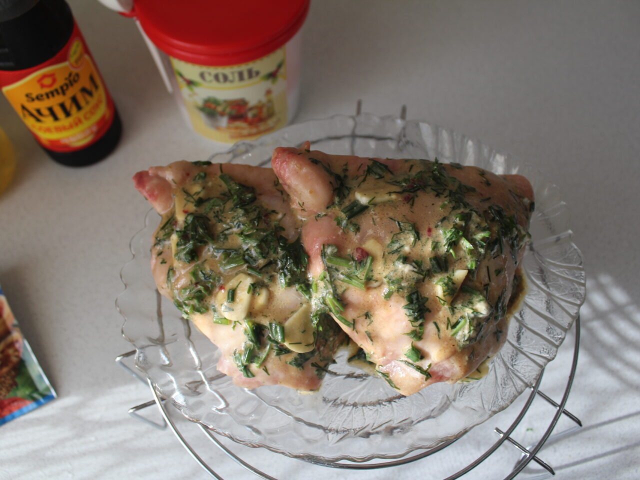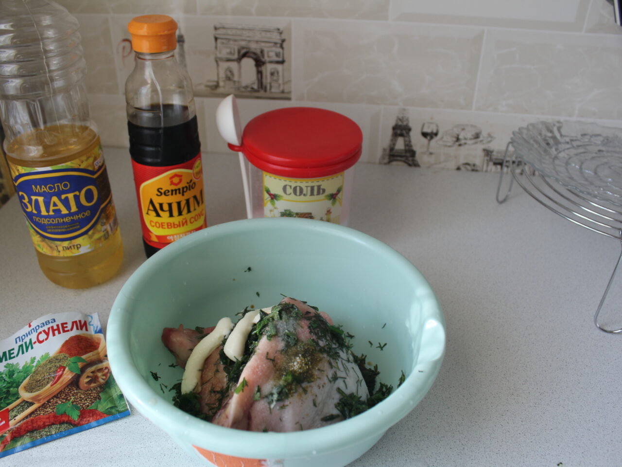 - Размороженные куриные бедра выложить в глубокую миску и сбрызнуть растительным маслом. По желанию посолить, влить соевый соус, добавить майонез и приправу для курицы или мяса.