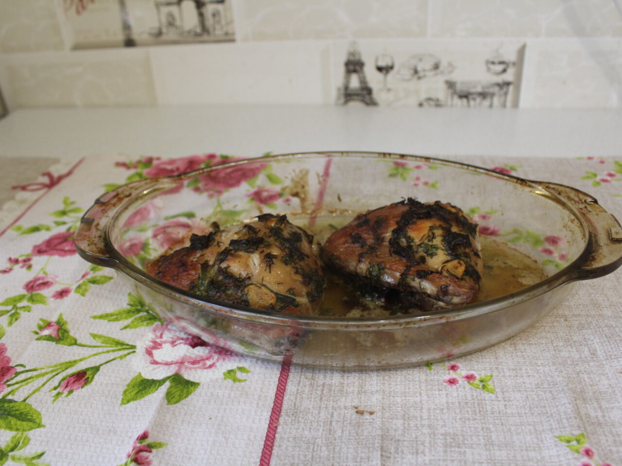 - Куриное мясо выложить в форму для запекания, налить немного воды и убрать в разогретую до 200 градусов духовку на 50 минут.