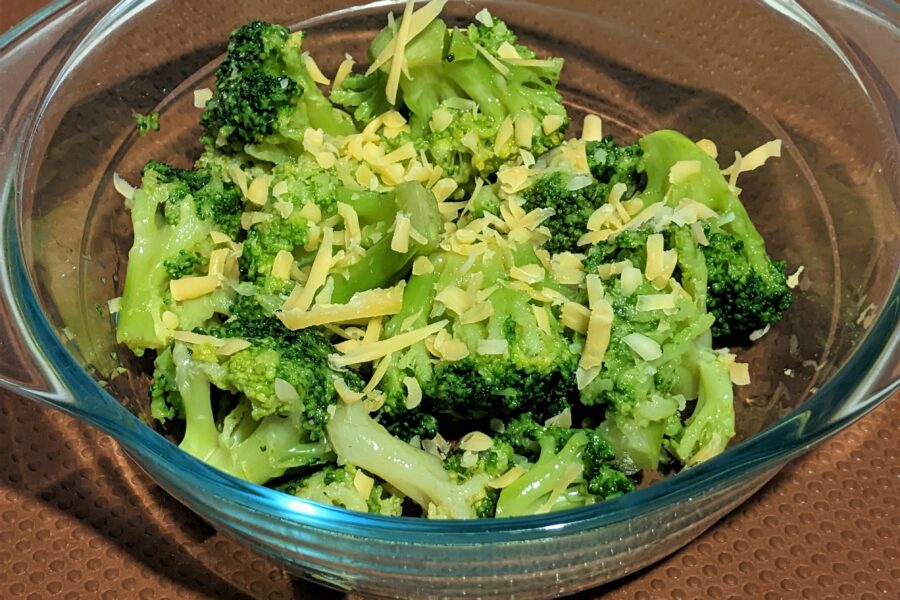 - Сливаем воду, выкладываем капусту в жаропрочную форму, смазываем оливковым маслом, посыпаем немного тёртым сыром. Открываем духовку (курица уже простояла в духовке 30 минут) и ставим форму с капустой. Продолжаем всё вместе запекать ещё 15 минут.