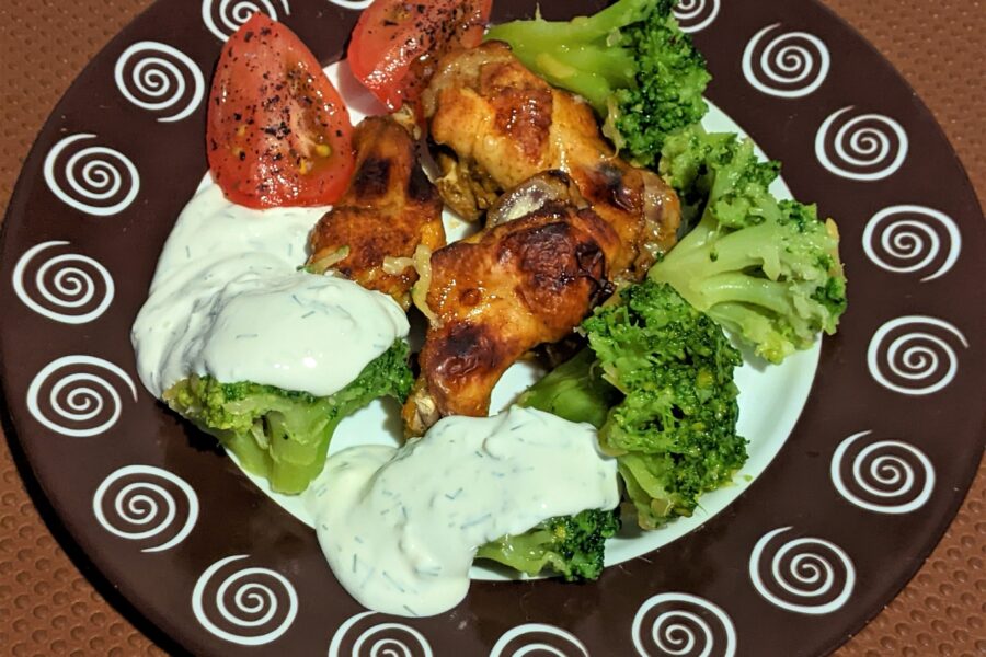 - Подаём крылья и брокколи со сметанным соусом (сметана, укроп, чеснок) и свежими помидорами.