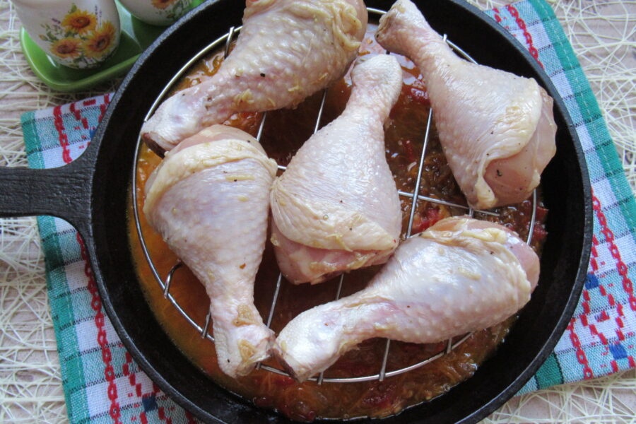 Кроме того, воспользуемся решеткой на ножках, которую установим над крупой. Именно на нее мы выложим мясную основу нашего блюда, пропитанную специями. Так в процессе запекания все соки, выделяющиеся из куриных ножек, будут стекать в емкость с гречкой и крупа волей-неволей пропитается ими. В итоге мы получим просто бесподобное на вкус кушанье. Это непременно стоит попробовать!