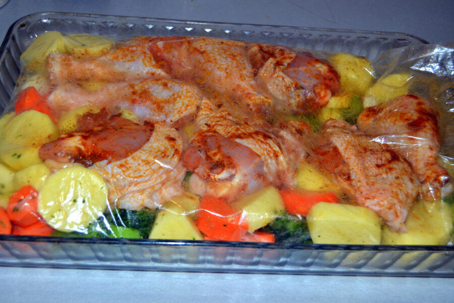 - В форму или на противень кладут пакет для запекания. Наполняют его овощами, добавляют специи «Для картофеля», встряхивают. Выравнивают ровным слоем. Поверх овощей в пакет укладывают куриные бедрышки и голени.