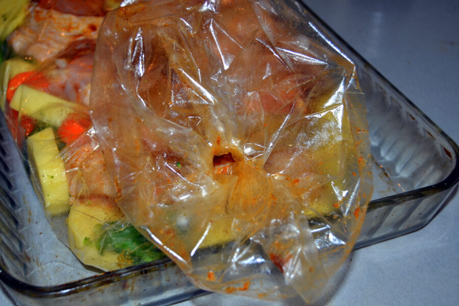 - Через указанный промежуток времени пакет аккуратно разрезают, раскрывая продукты. Действуют осторожно, чтобы не обжечься паром. Готовность картофеля проверяют зубочисткой.