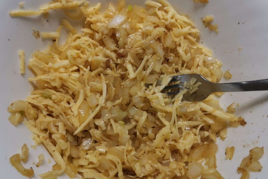 - Трем сыр на крупной терке, смешиваем его с луком и чесноком.