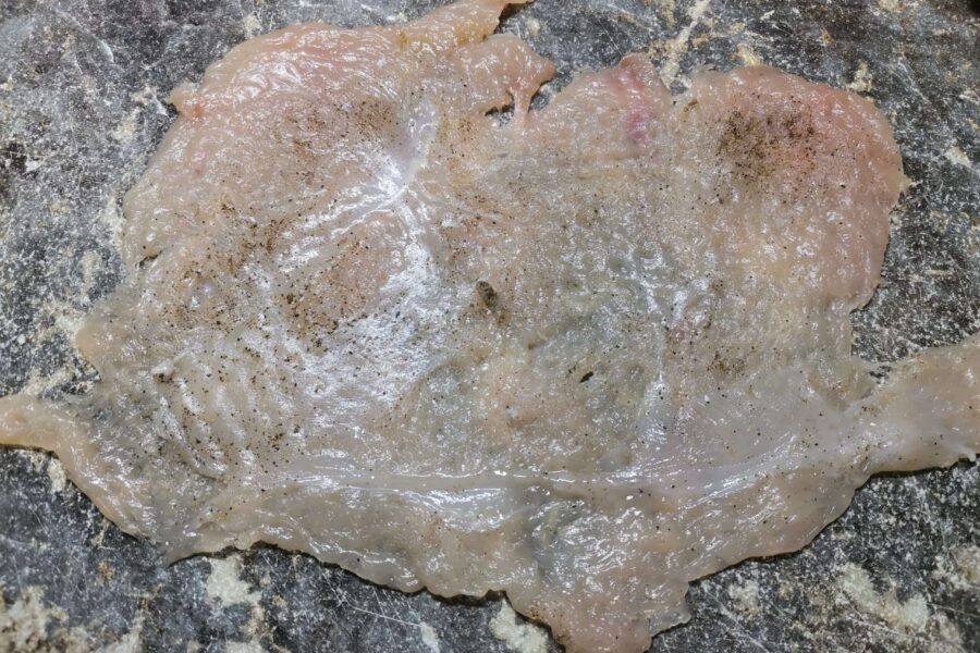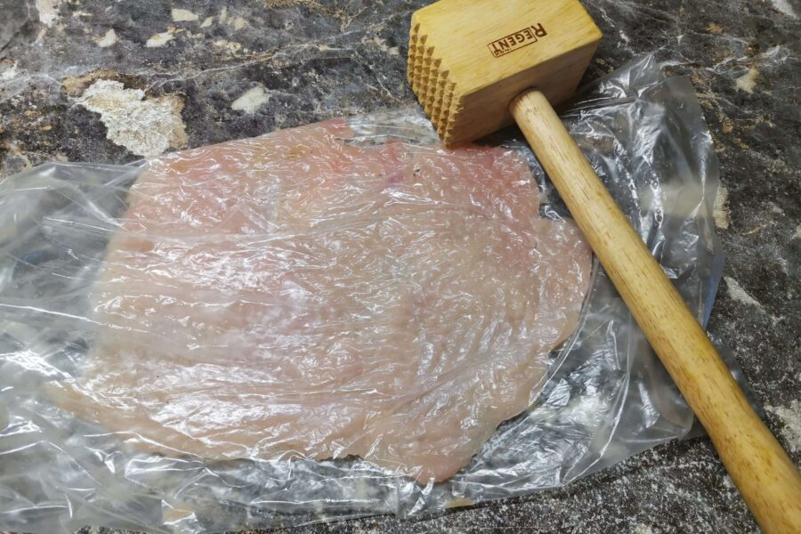 - Отбиваем куриное филе до состояния очень тонкой, практически просвечивающейся отбивной.