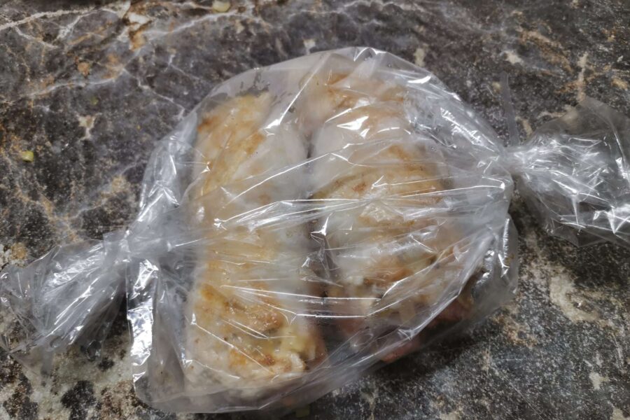 - Кусочки куриного филе выкладываем в полиэтиленовый пакет.