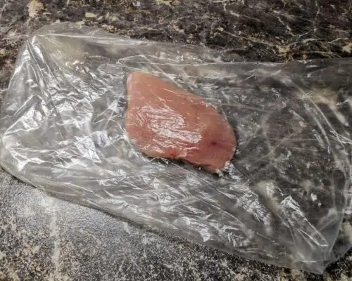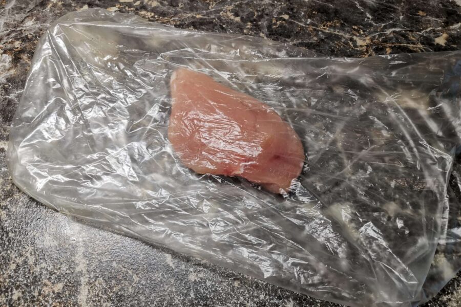 - Отбиваем молотком для мяса. В пакете это делать удобнее потому, что мясо не будет разлетаться в разные стороны.