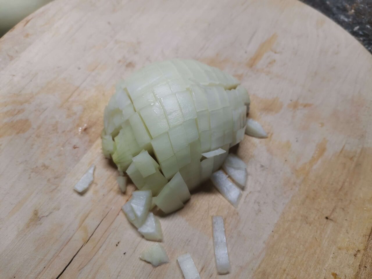 - Небольшими кусочками режем луковицу.
