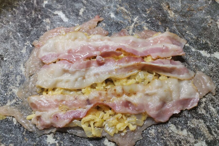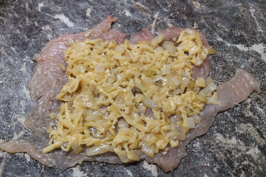 - На отбивную из курицы выкладываем смесь из сыра и лука. С одного края начинку не кладем, чтобы закончить заворачивать именно на этом месте. Так рулетик будет держаться крепче.
