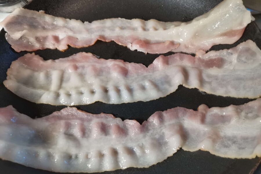 - На сухой сковороде обжариваем бекон с двух сторон в течение нескольких секунд. Масло добавлять не надо, и пережаривать тоже.