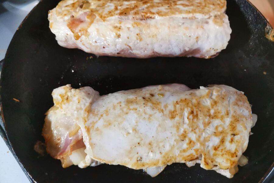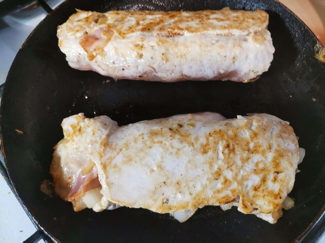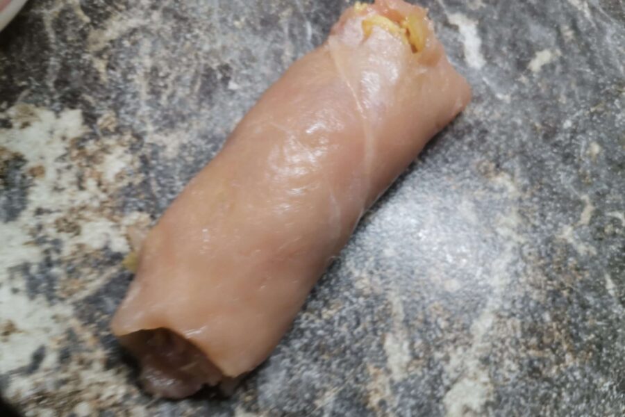 - И аккуратно заворачиваем рулетик. Можно закрепить его с помощью деревянной шпажки или зубочистки, но если филе достаточно тонко отбито, они не потребуются.