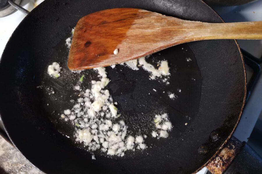 - Мелко режем или давим на чеснокодавилке чеснок. Обжариваем его на жире, который останется от бекона, в течение минуты, до появления приятного запаха.
