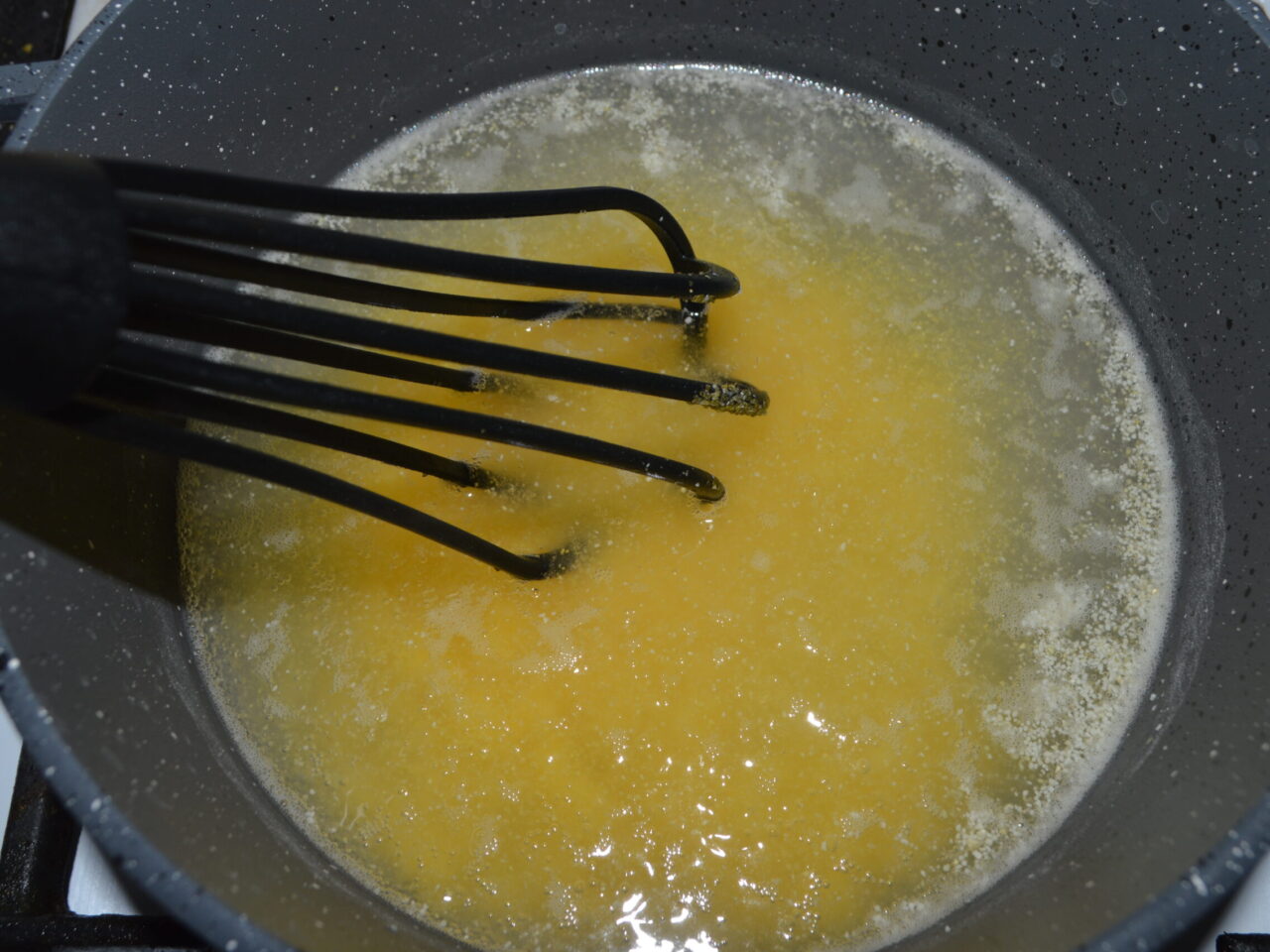 - Сразу же перемешайте венчиком, чтобы избежать образования комочков. Сначала всыпьте полстакана муки.