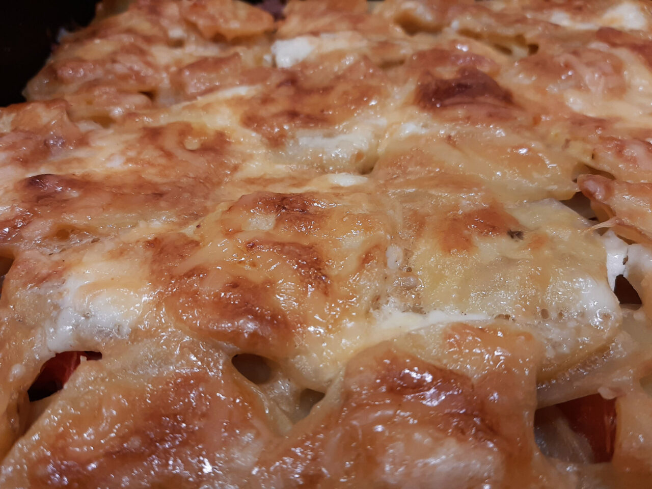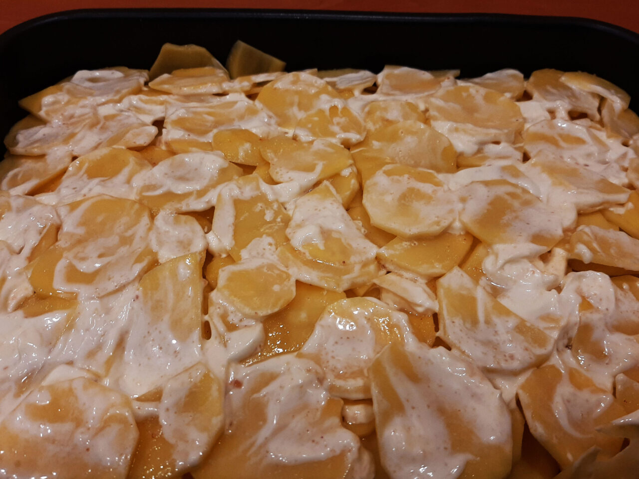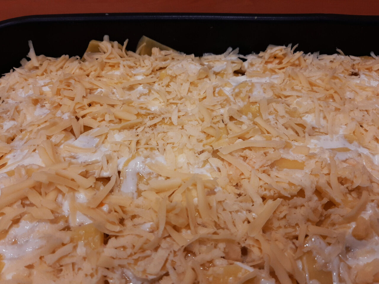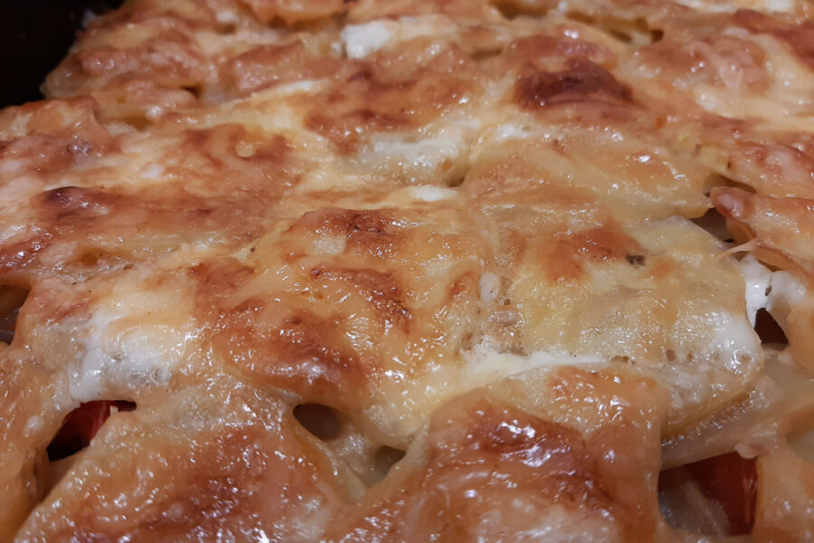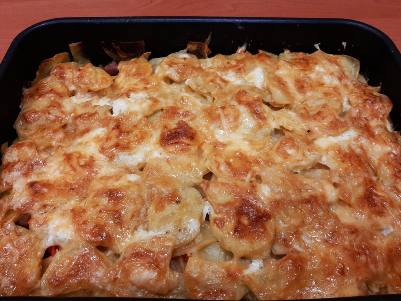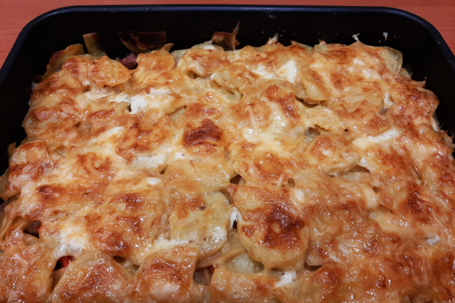 Нарезанные продукты выкладывают слоями. Чаще всего мясные ломтики кладут снизу, закрывая их картофельной «шубой». Но в некоторых рецептурах предлагается, наоборот, укладывать мясо на картофель. Обязательным компонентом является гратен – золотистая сырная корочка, которая получается при запекании в духовке.