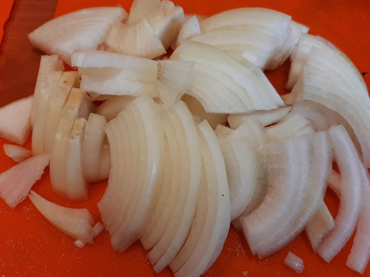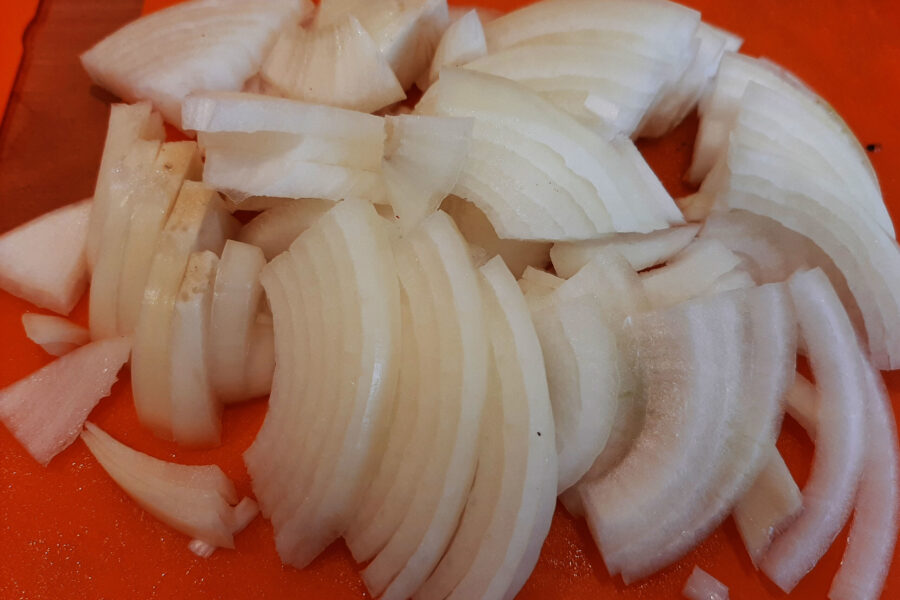 - Репчатый лук очистить от шелухи, разрезать на четвертинки и тонко нашинковать. Соединить луковую нарезку с мясом.