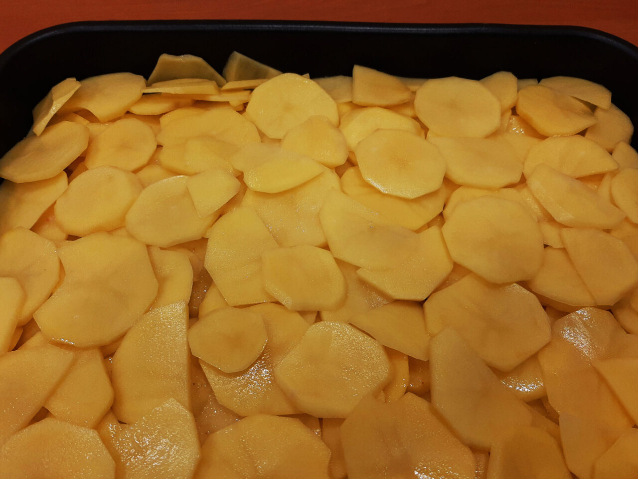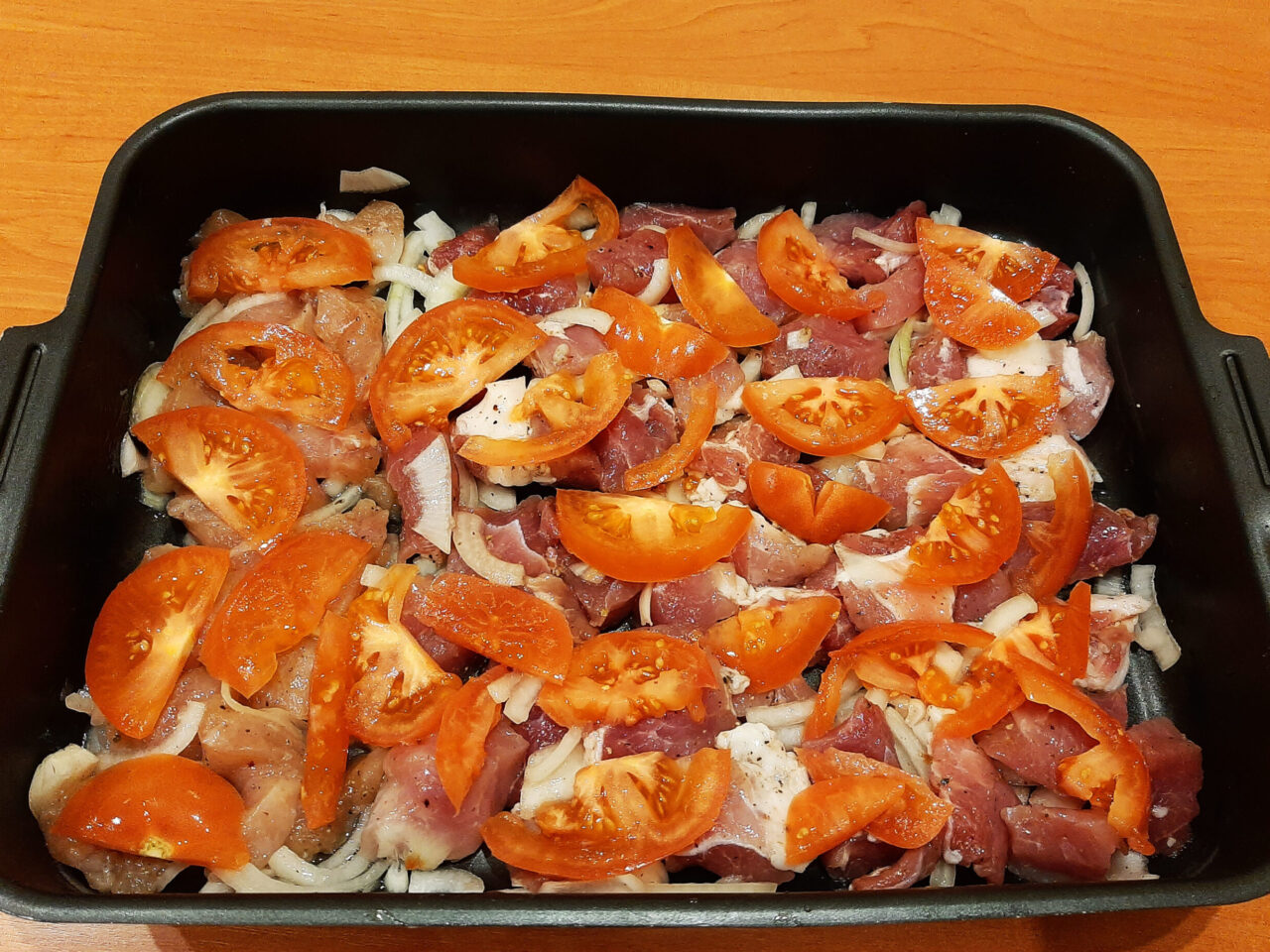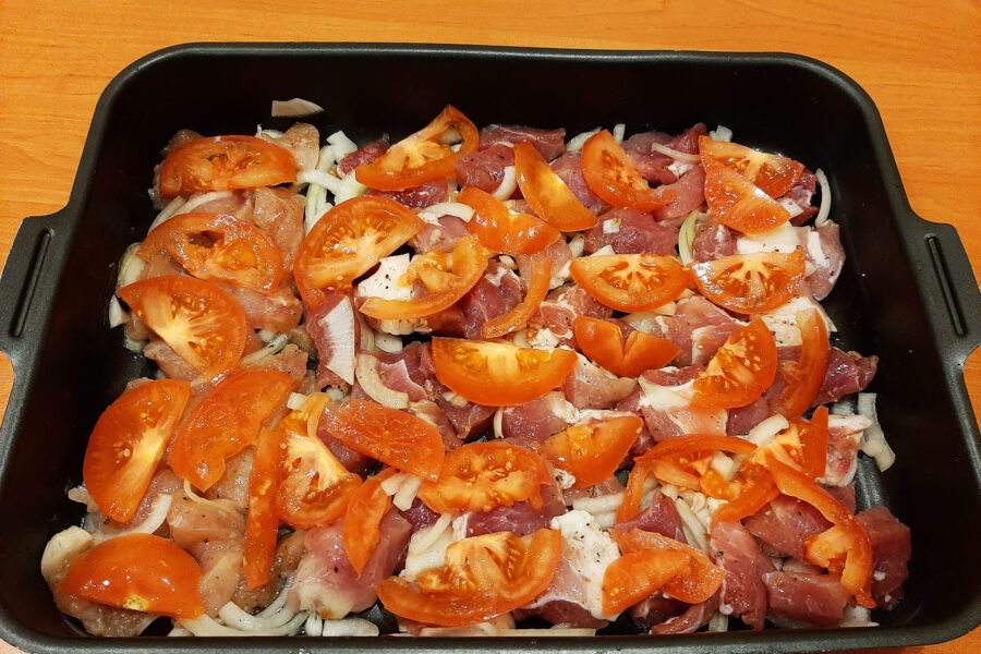 - Форму для запекания или противень смазать рафинированным растительным маслом. Выложить слой мяса с луком, на него – нарезанные помидоры. Далее разложить слой картофеля, посолить и поперчить. Выложить оставшиеся картофельные слайсы. Снова посыпать солью и перцем.