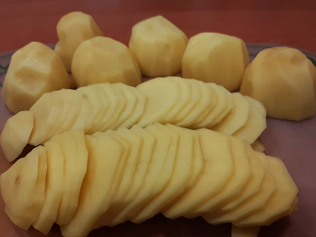 - Картофель очистить, нарезать на тонкие кружочки. Делать толстые ломтики не рекомендуется, так как в этом случае картошка потребует больше времени для запекания. Томаты разрезать пополам, а затем на дольки.