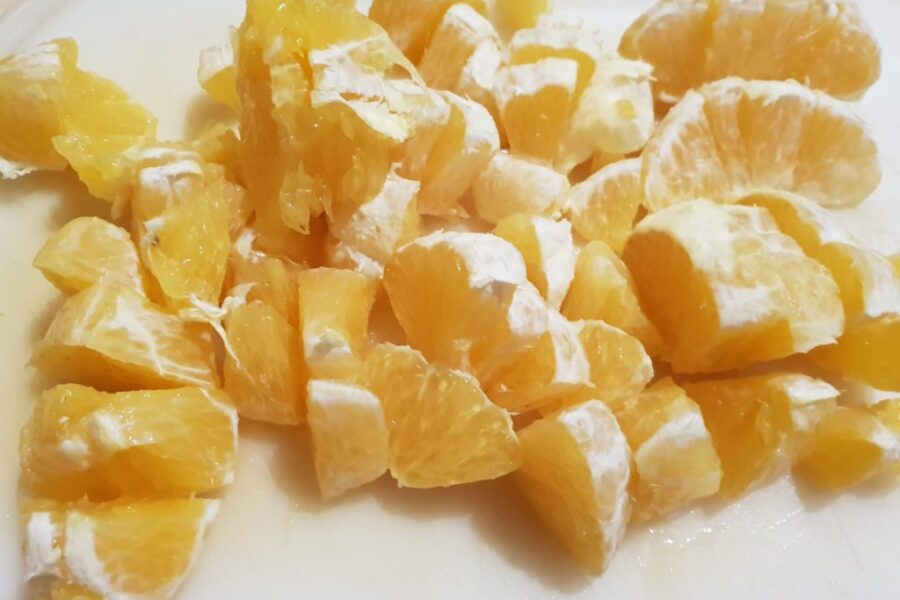 - Нарежьте очищенные апельсины на мелкие кусочки.