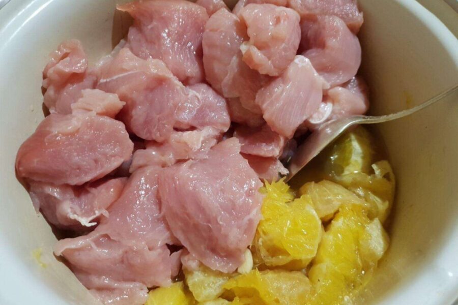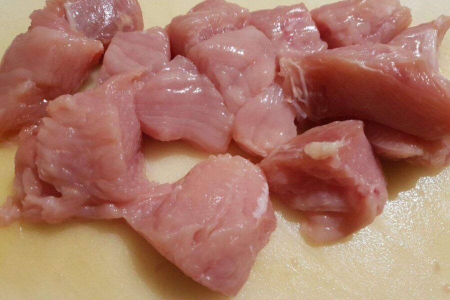 - Вымойте мясо, порежьте на мелкие кусочки.