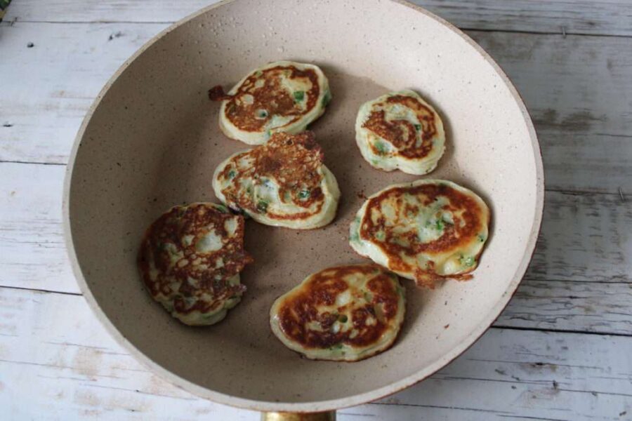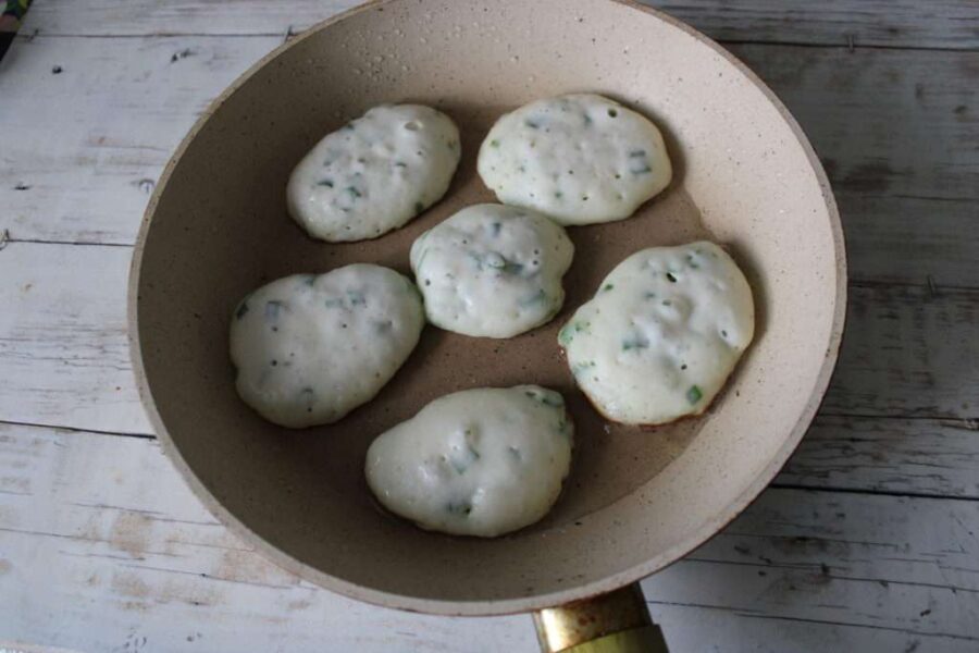 - Ложкой выкладываем заготовки на раскаленное масло. Если хочется добиться идеальной круглой формы оладушек, можно воспользоваться специальными силиконовыми колечками.