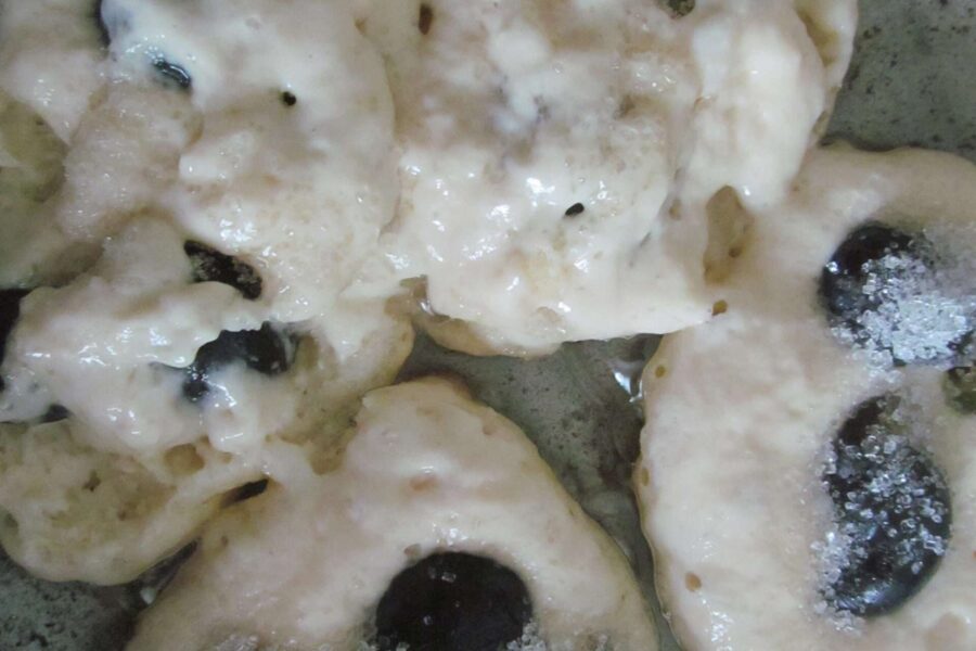 - Далее в сковородку нужно налить растительное масло и ложкой выкладывать тесто. Уже сверху теста кладу кусочки чернослива и опять ложкой сверху тесто.