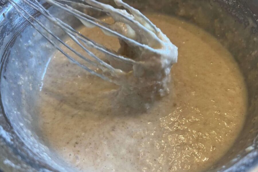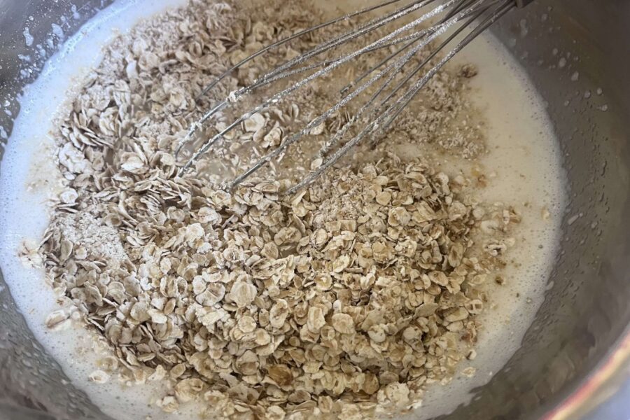 - Масло растопить и охладить. Добавляю к яичной смеси сливочное и растительное масло, молоко. Перемешиваю венчиком. Половину овсяных хлопьев перемалываю в муку.