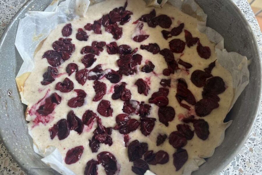 - Выстилаю форму пекарской бумагой. Тесто выливаю в форму и выкладываю сверху вишню.