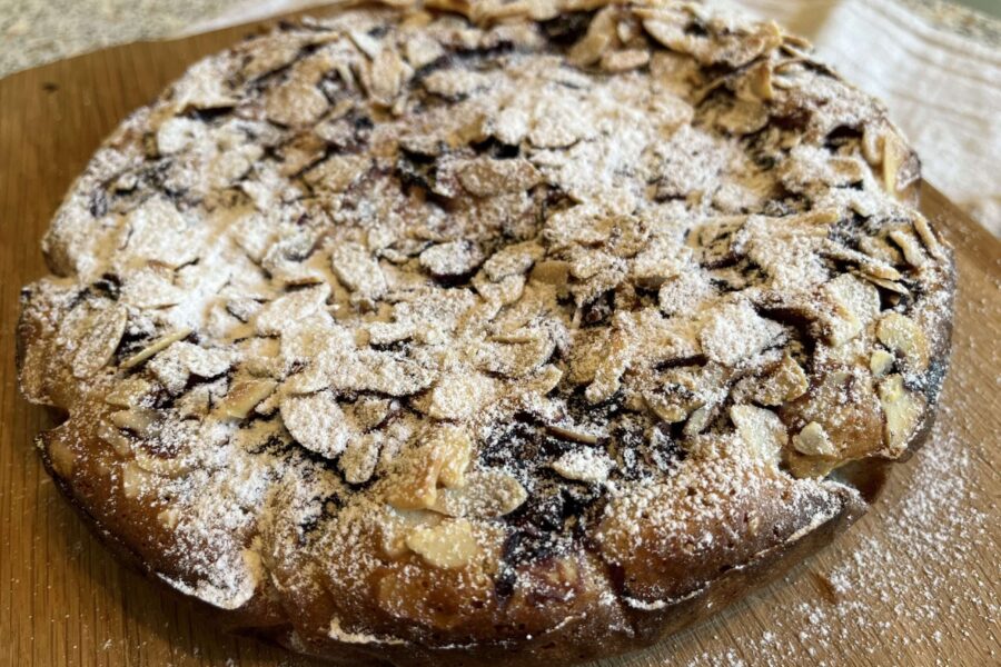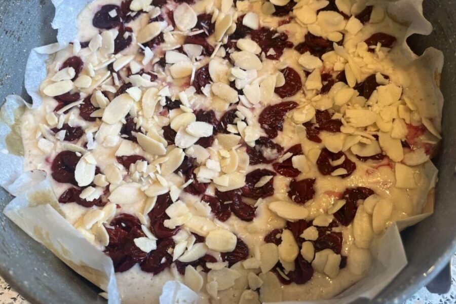 - Часть ягод утапливаю в тесте. Верх я посыпала листиками миндаля.