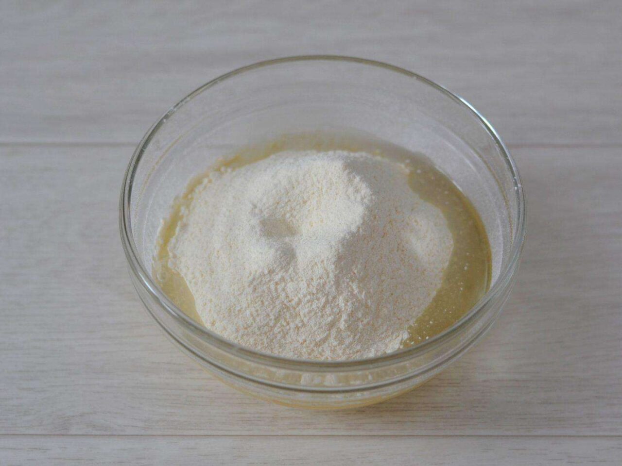 - Просеиваем в чашу муку и добавляем разрыхлитель.
