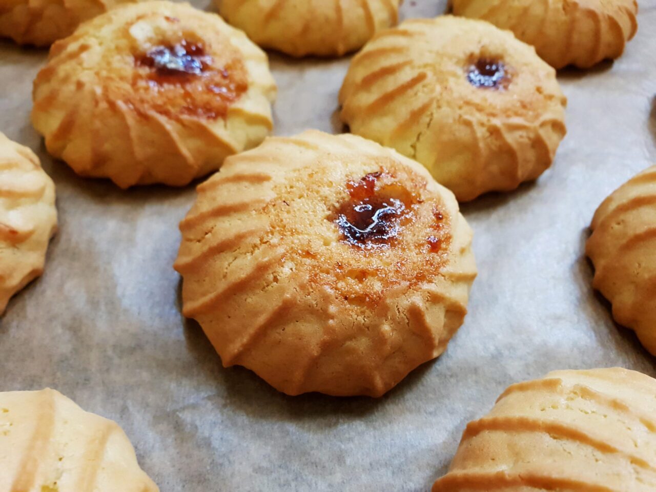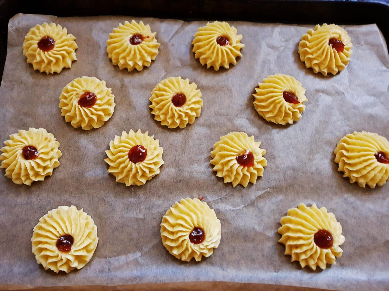 - Если Вы планируете делать печенье с вареньем, то после отсадки нужно аккуратно сделать углубления для варенья. Это легко сделать чуть влажным пальцем или палочкой для японской кухни. Далее в углубления выложить немного варенья. Его можно также отсадить из кондитерского пакета