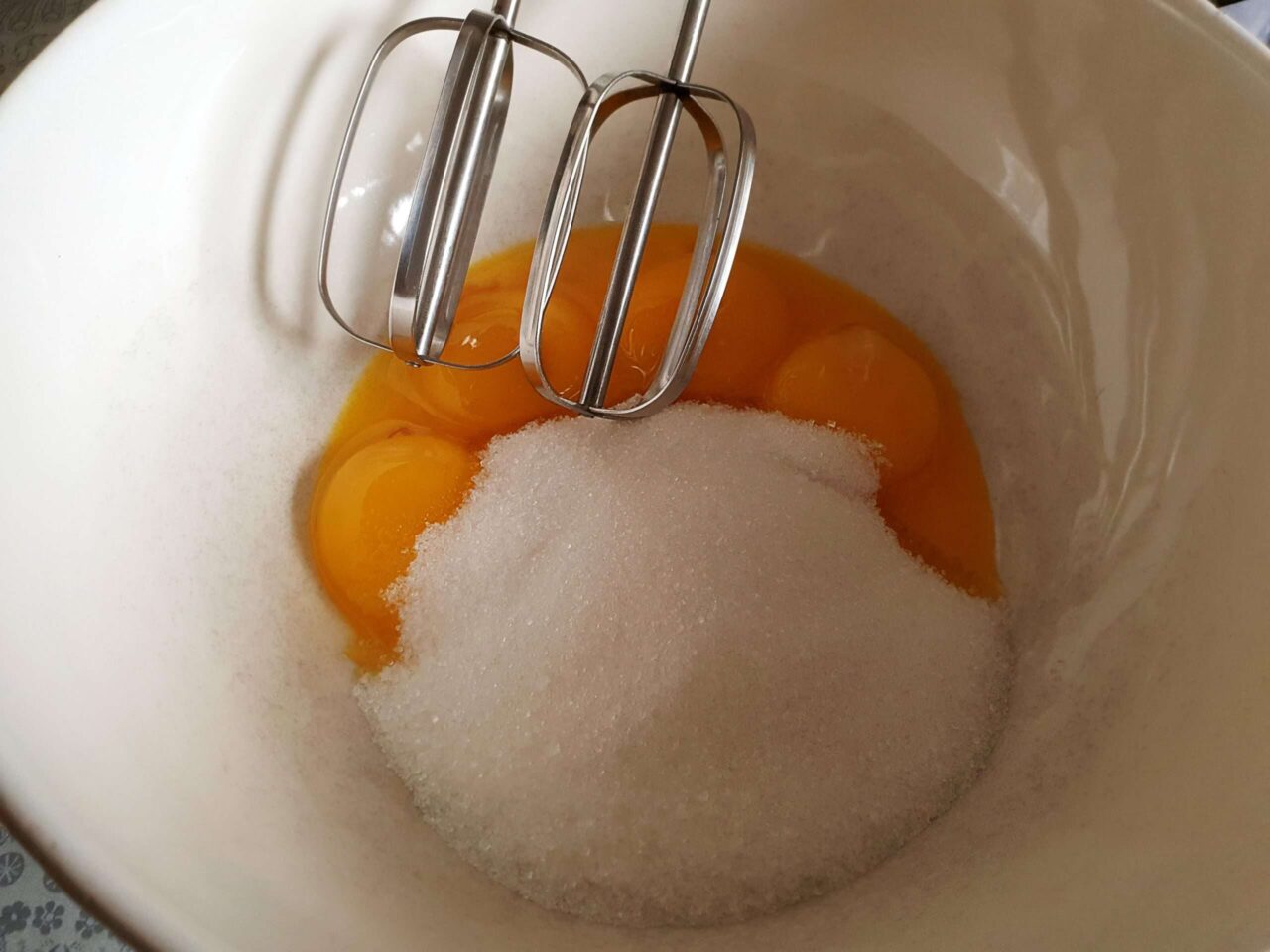 - Желтки взбить в пышную пену с сахаром и ванилином. Обычно взбивание занимает около трех минут.