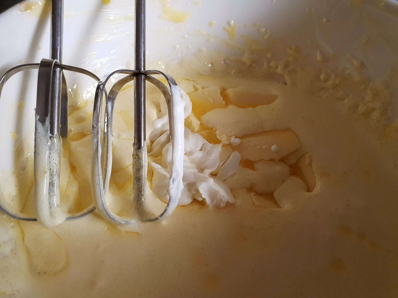 - Добавить к взбитым желткам сметану и мягкое масло (масло должно быть комнатной температуры, можно чуть-чуть подтопить его в микроволновке на режиме «разморозка», если в доме у Вас прохладно, но ни в коем случае не топить полностью до жидкого состояния).