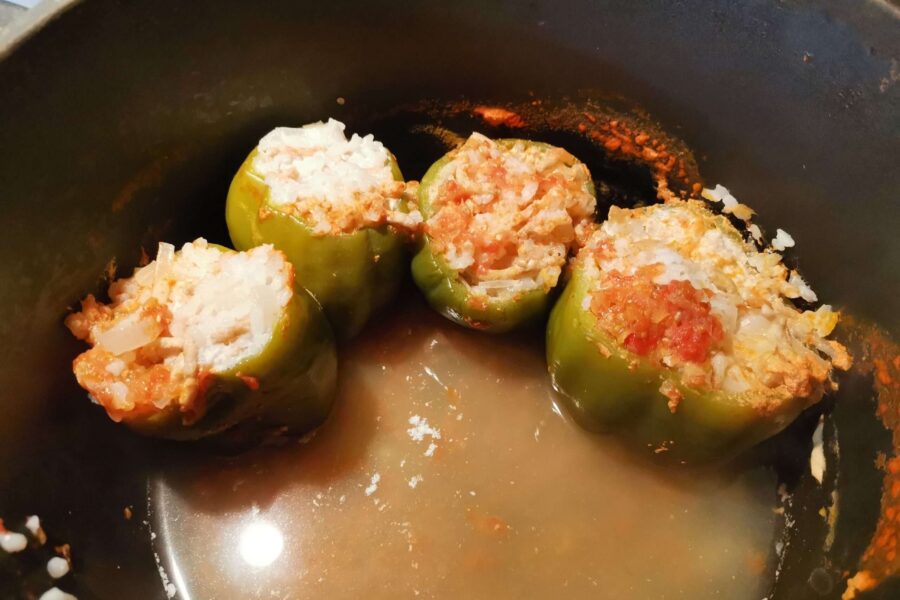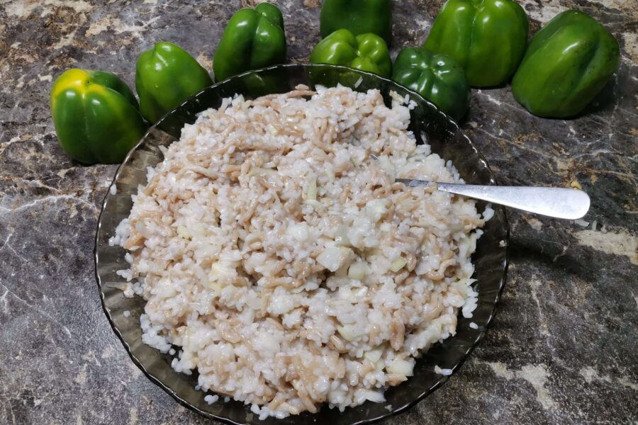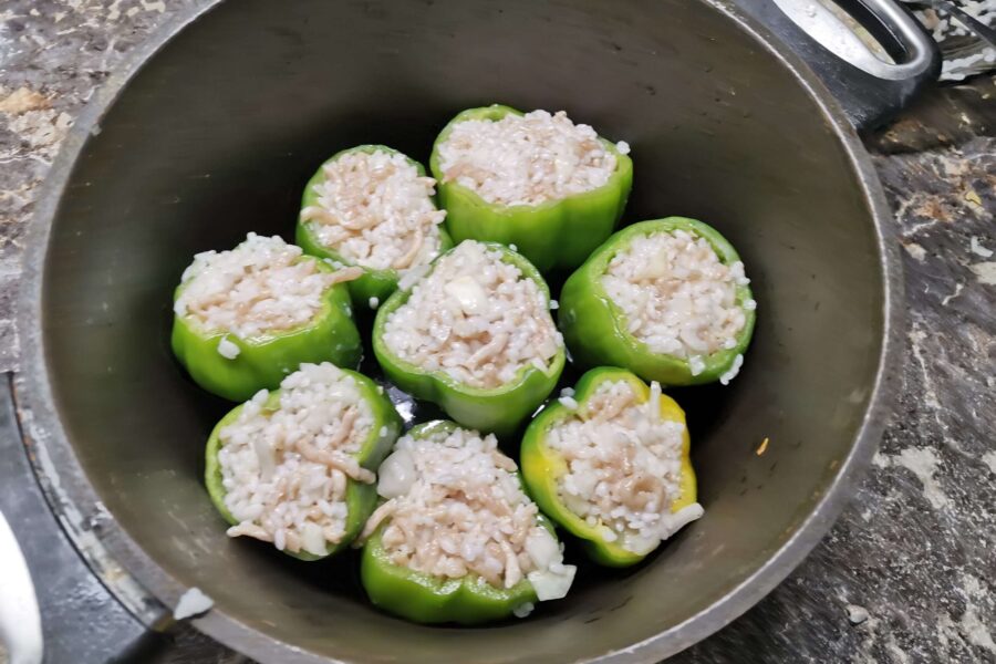 - Заполняем пустые перцы фаршем. Не надо укладывать начинку плотно – рис еще разварится и заполнит пустые места.