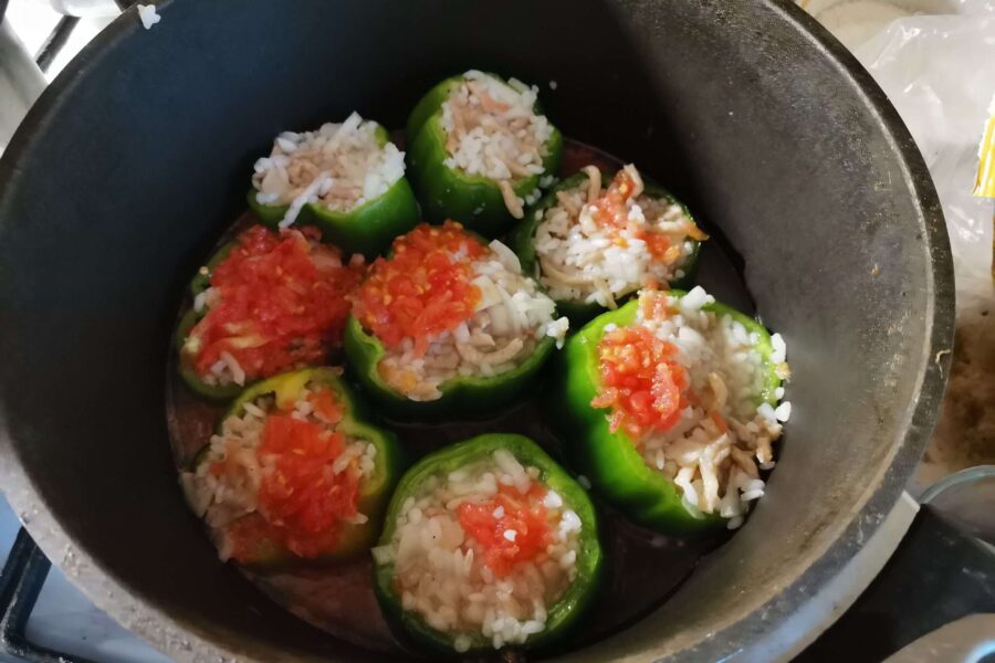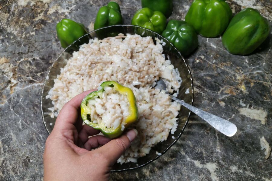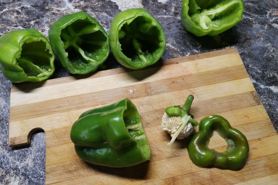 - Отрезаем «крышечки», вынимаем внутренности. Овощи промываем, чтобы не осталось ни одной семечки. Сами крышечки можно использовать в салатах или других блюдах.