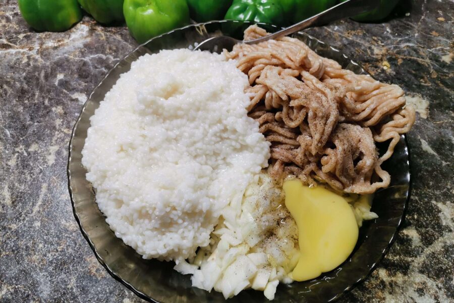 - Смешиваем рис, фарш, резанный лук и яйцо. Солим, перчим, добавляем другие приправы.